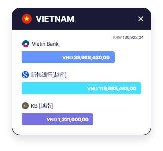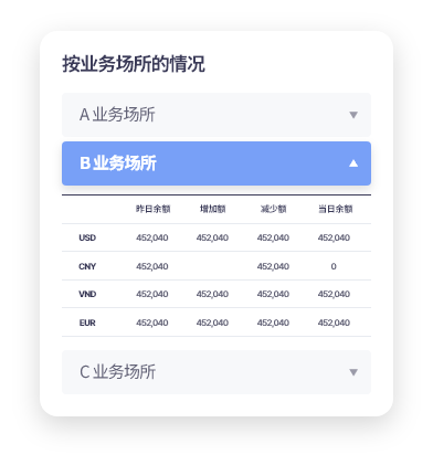 可以容易确认海外营业场所的总持有资金现状。(按货币/国家) 与前一天的市价相比,很容易确认持有资金的增减情况。